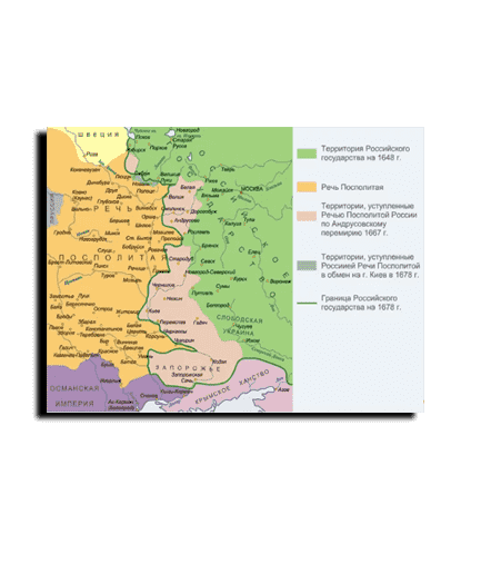 Андрусовское перемирие между Россией и Польшей. К России отошла Левобережная Украина и Смоленск.  Подробнее...